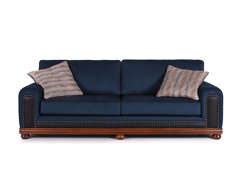 Νεοκλασικός καναπές με σύγχρονη αισθητική. Σκελετός από μασίφ ξύλο οξιάς, στον οποίο οι ενώσεις γίνονται με μόρσα. Τα μαξιλάρια του καθίσματος είναι σε φόρμα, από λάστιχα μεγάλης πυκνότητας με πλήρη επαναφορά, επενδεδυμένα με βάτα dacron 5cm και τοποθετημένα σε βαμβακερό κελύφιο. Υπάρχει δυνατότητα επιλογής της σκληρότητας του καθίσματος. Τα μαξιλάρια της πλάτης και τα διακοσμητικά περιέχουν πούπουλο χήνας. Σε όλα τα μαξιλάρια τα ύφασματα είναι αφαιρούμενα. Δυνατότητα επιλογής υφάσματος και αποχρώσεων λούστρου ή πατίνας.