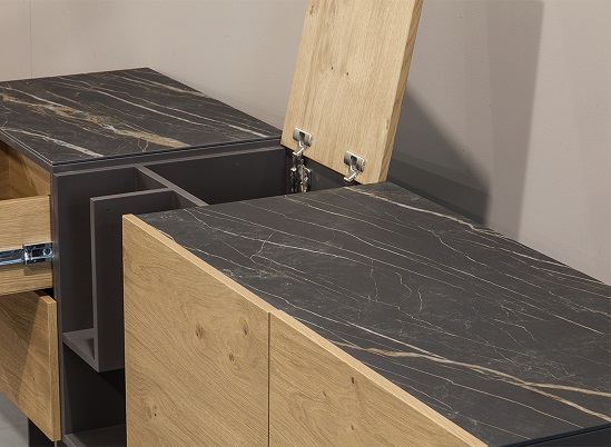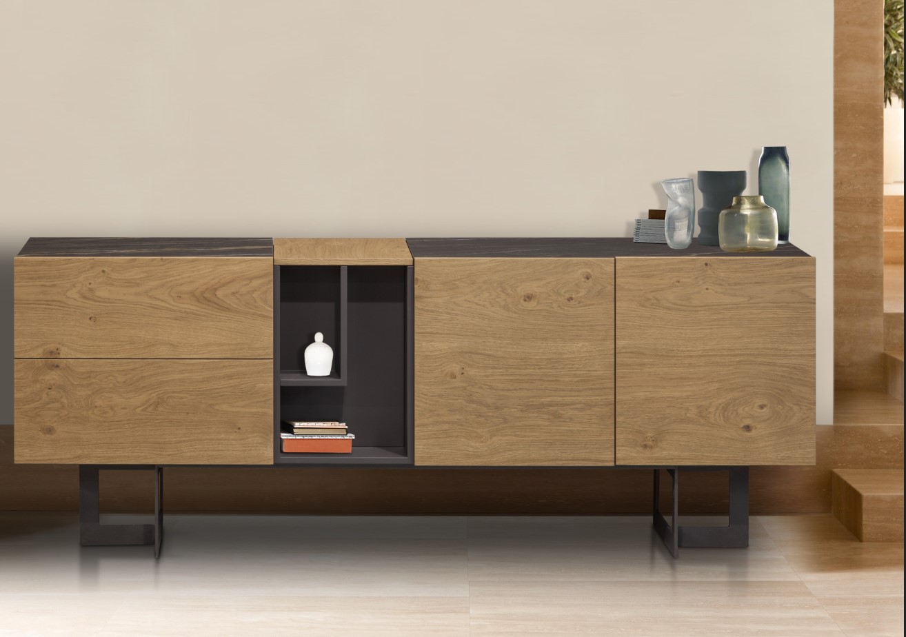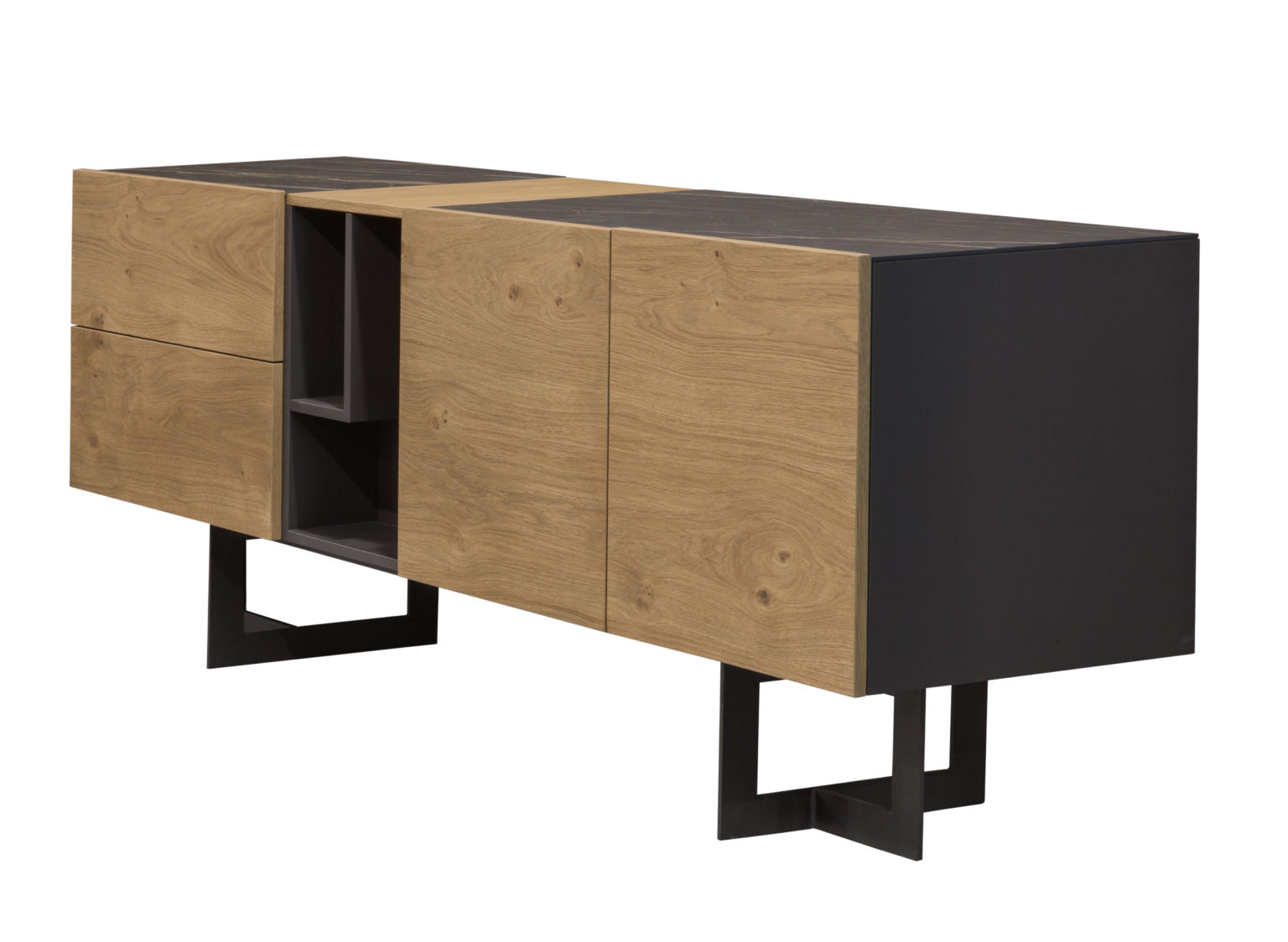 Μπουφέ Wave με ξύλο ρουστίκ δρυς, μεταλλικά πόδια και κεραμική επιφάνεια.