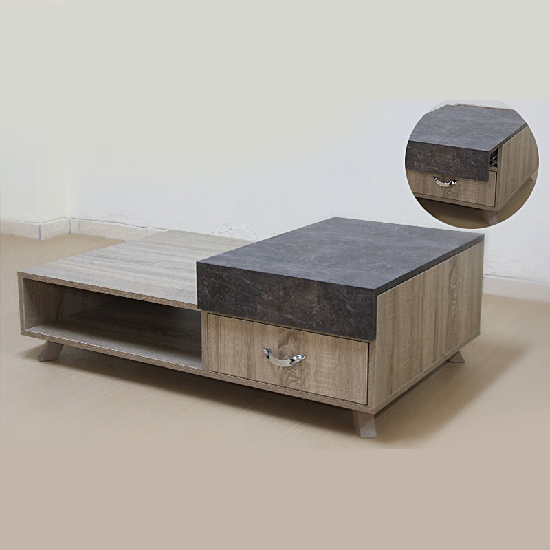 Τραπέζι σαλονιού σε 2 επίπεδα και σε διχρωμία τεχνοτροπίας φυσικού ξύλου και γρανίτη.Διαθέτει σερβιτόρο/συρρόμενο καπάκι με αποθηκευτικό χώρο καθώς και συρτάρι για επιπλέον αποθήκευση.Ιδιαίτερη πινελιά τα κυρτά μασίφ ξύλινα πόδια του.Δυνατότητα επιλογής χρωμάτων.